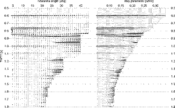 A synthetic CMP seismic gather before (left) and after (right) NMO correction. The dashed line shows points of constant ray parameter. The synthetics and ray-parameter modeling also performed in the IGeoS package.