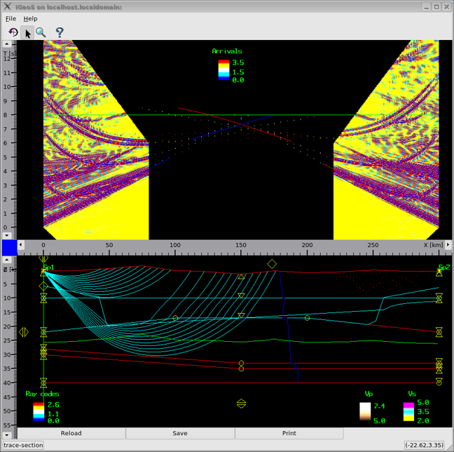 Wide-angle ray tracing. This velocity model is compatible with those used by the popular rayinvr package by Colin Zelt. Vp, Vs, and optionally Q-factor and density models can be displayed in color shading. Zooming and panning, selection of plotting options, colors, and palettes, and travel-time reduction can be varied interactively. The status bar displays any parameters of the model under cursor. In the near future, layer depth and velocity nodes will be modifiable using the mouse.