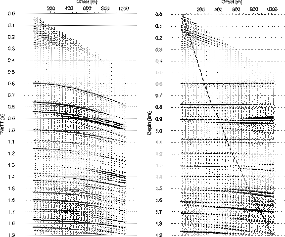 A synthetic CMP seismic gather before (left) and after (right) NMO correction. The dashed line shows points of constant ray parameter. The synthetics and ray-parameter modeling also performed in the IGeoS package.