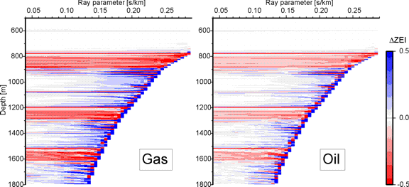 Exact (Zoepritz) ray-path impedances for oil and gas reservoir cases.