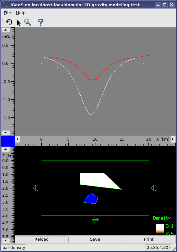 Simple 2D gravity modeling tool, also designed as an IGeoS processing job. The calculated and residual gravity profiles change instantly as one modifies the model. This can be conducted concurrently with 2D wide-angle ray tracing and Receiver Function modeling. The observed and calculated gravity can be filtered "on the fly" in order to emphasize the effects of the deeper or shallower structures.