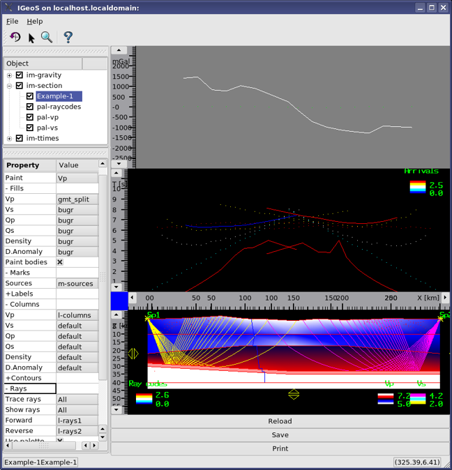 Wide-angle ray tracing. This velocity model is compatible with those used by the popular rayinvr package by Colin Zelt. Vp, Vs, and optionally Q-factor and density models can be displayed in color shading. Zooming and panning, selection of plotting options, colors, and palettes, and travel-time reduction can be varied interactively. The status bar displays any parameters of the model under cursor. In the near future, layer depth and velocity nodes will be modifiable using the mouse.