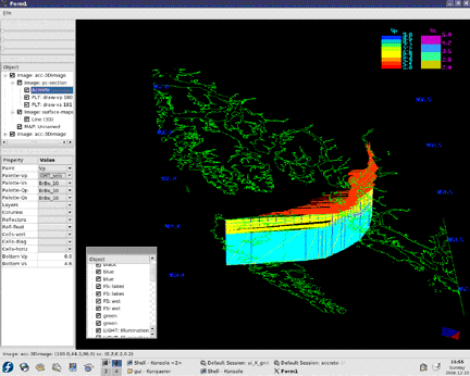 The same program is also able to display seismic profiles in their true 3D geometries and on spherical Earth. Here, we show a 3D view of a line from ACCRETE project, with coastline basemap obtained directly from GMT datasbases. P- and S-wave velocities may be selected in the Property Editor (left) and displayed using over 40 preset and also custom palettes. See the SIA processing job that created this display.