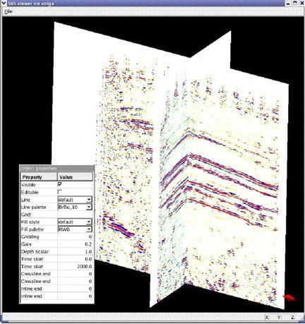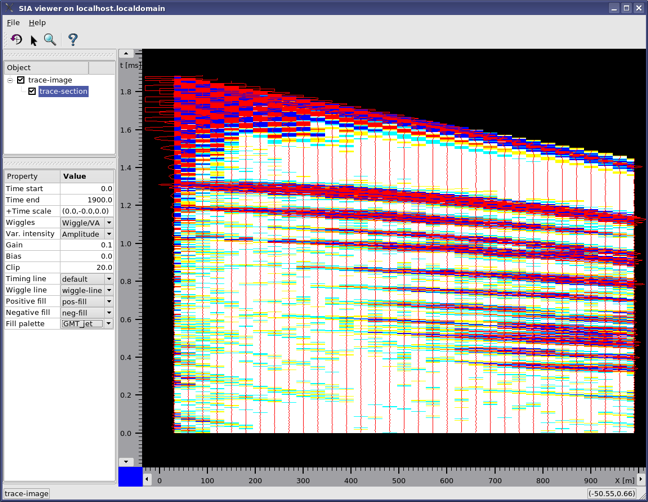 A synthetic reflection seismic section. Trace display modes (variable-area, wiggle, variable intensity), time reduction, and many plotting options (lines, fills, palettes) are controllable from the Property manus (left). The display also allows interactive picking of times and extraction of amplitudes. Note that the synthetics were also generated in the IGeoS package.